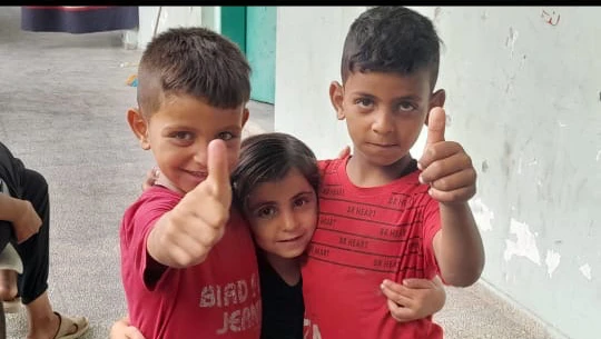I am Karam Fathi, a 7-year-old child, and I live with my family in extremely difficult humanitarian conditions. I have two younger siblings, Salam (6 years old) and Batoul (4 years old). We have been bombed more than four times, and we were pulled out from under the rubble. We now live in an unbearable situation of pain, fear, and deprivation.